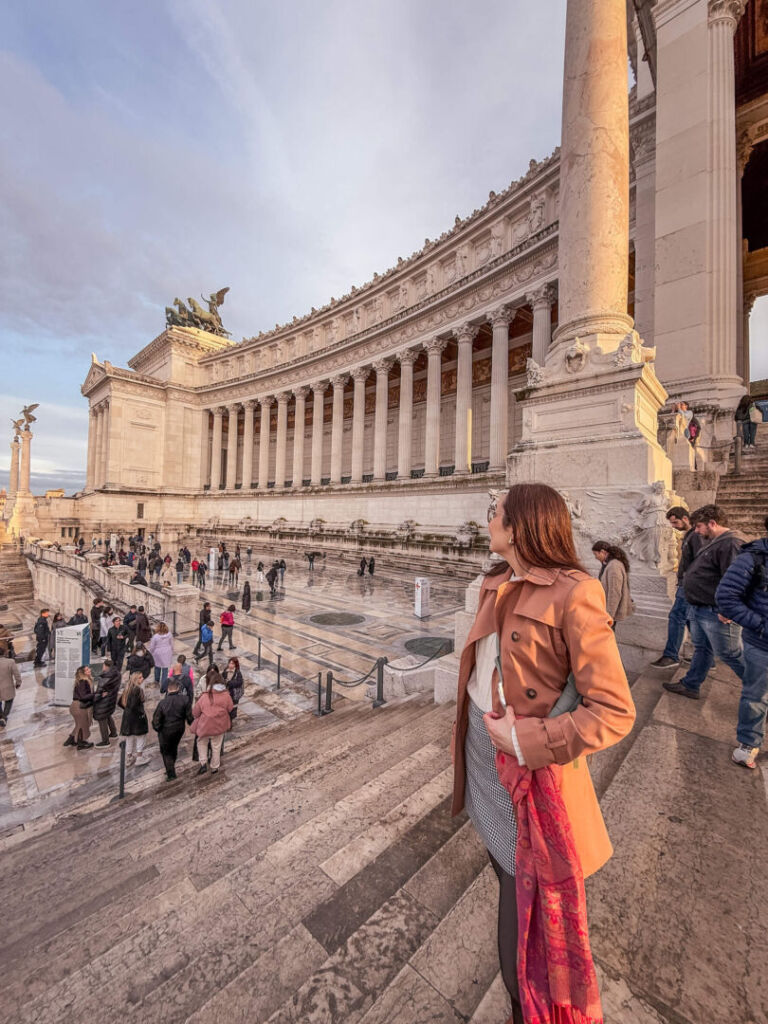 Fomos andando até o Altare della Patria, um grande monumento construído no início do século XX em homenagem a Vítorio Emanuelle II, o primeiro rei da Itália unificada, o monumento abriga também o Túmulo do Soldado Desconhecido, sempre guardado por uma chama eterna. Lá de cima tem uma vista para o Coliseu e caso você queira subir ainda mais, tem um elevador pago para uma vista panorâmica (nesse não fomos e nem na parte paga do Altares-mores).