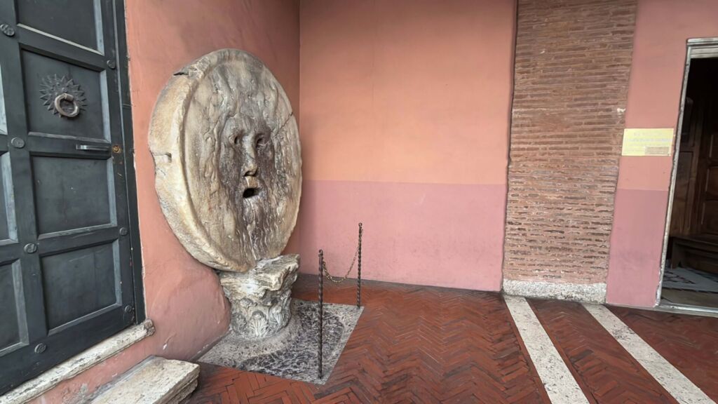 De lá, fomos até a Bocca de la Veritá, uma máscara feita de mármore que tem uma lenda de que quem conta uma mentira com a mão lá dentro, a boca se fecha. Custava 1 ou 2 euros para tirar uma foto com ela, mas a fila estava muito grande e não quisemos esperar.